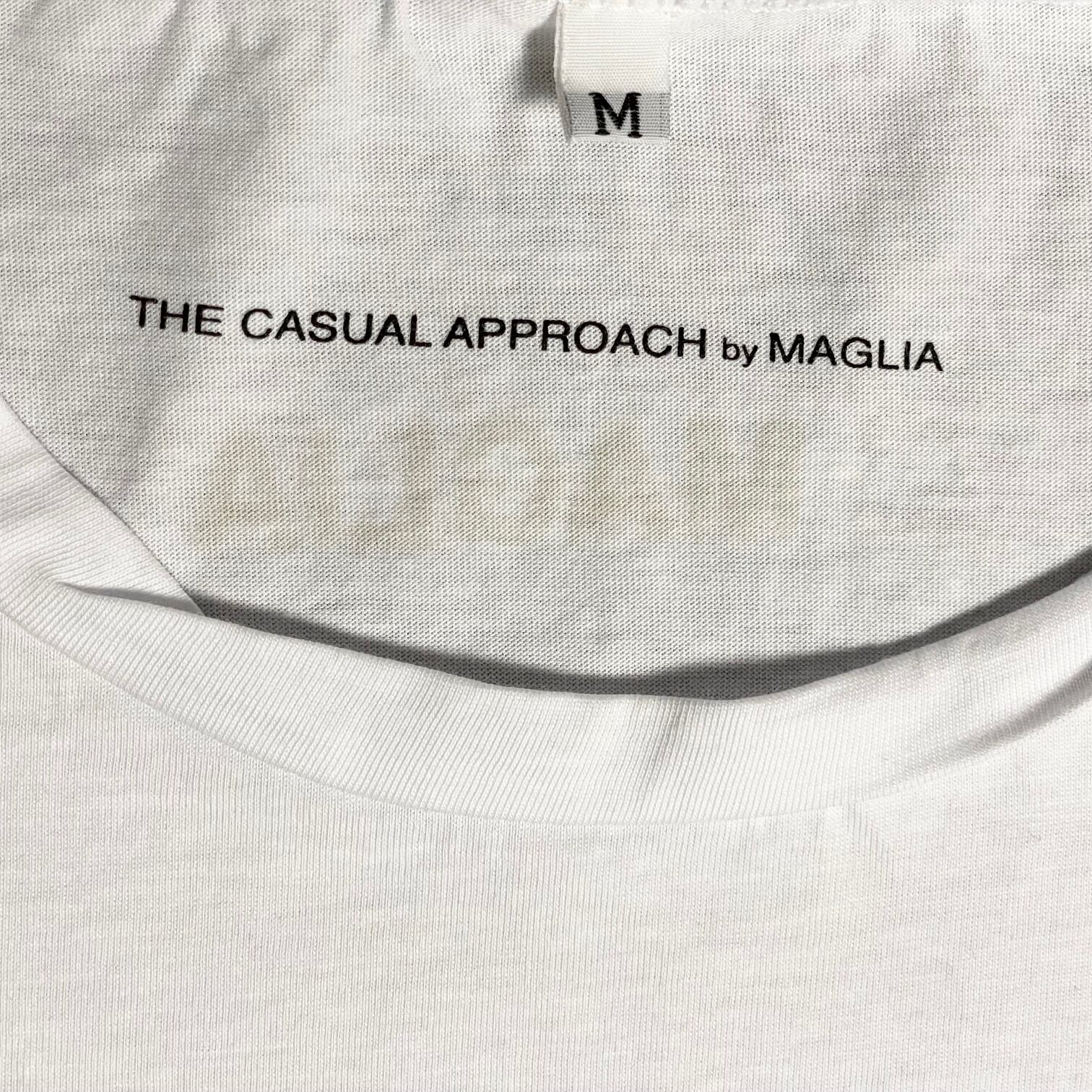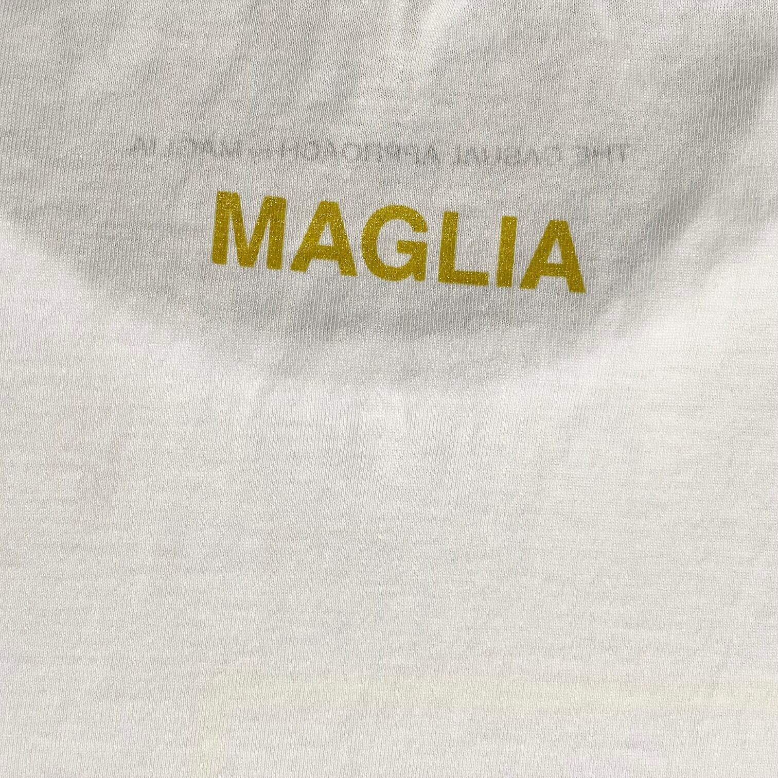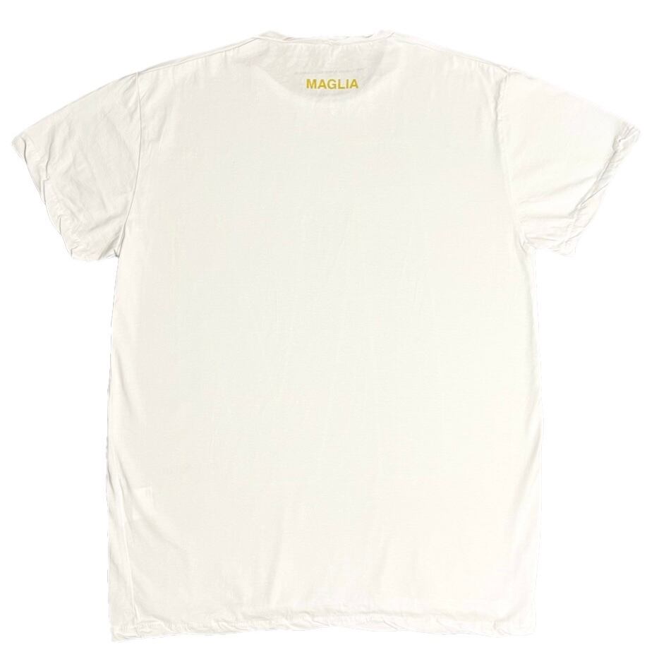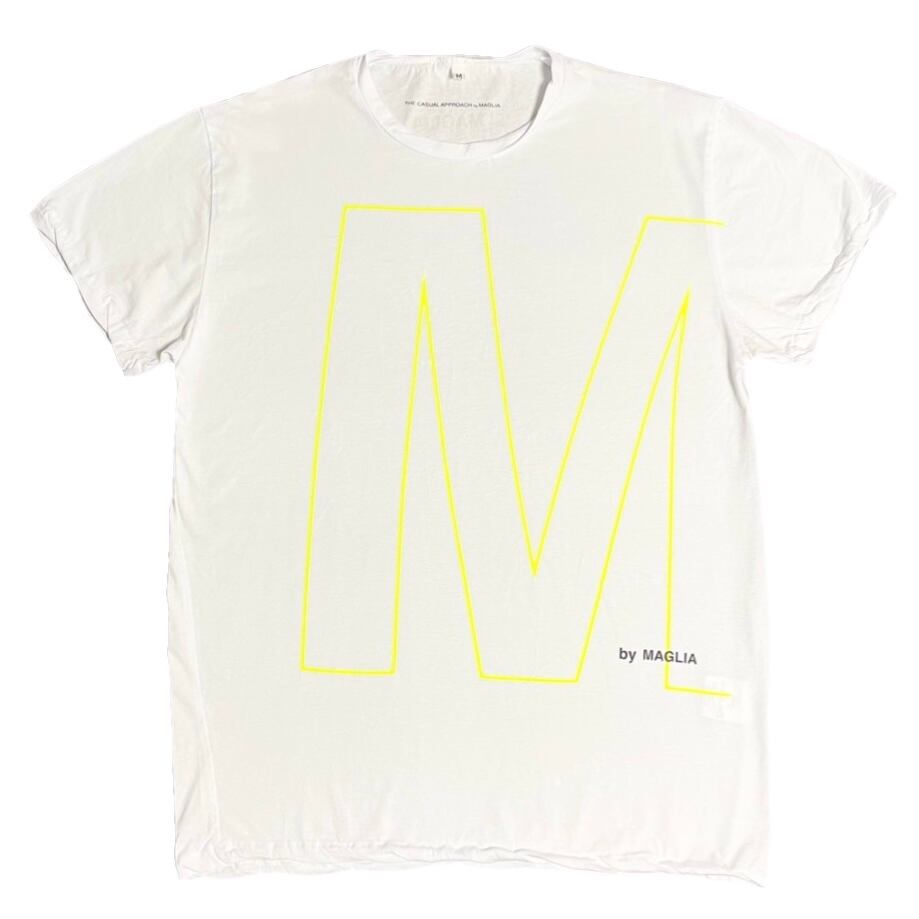 マリアのTシャツはハンドメイド製で柔らかい素材で襟や袖、裾などをねじって縫い込むなど細部までこだわっており、こちらのモデルは前面にマリアの頭文字のMを大きく蛍光イエローでプリントしており、ブラックの「by MAGLIA」がアクセントになっており、背面首裏にもゴールドでMAGLIAの文字がプリントされております。