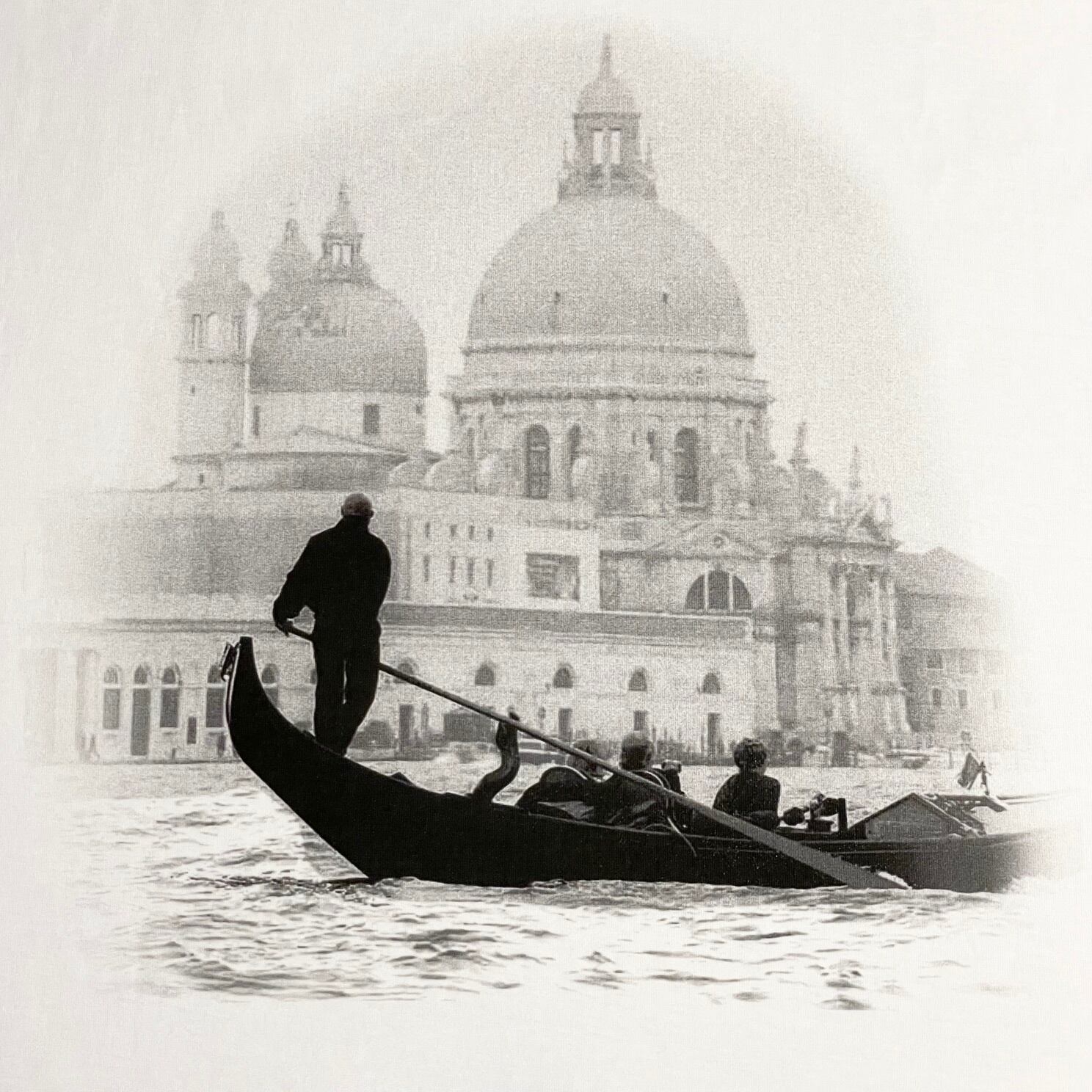マリアのTシャツはハンドメイド製で柔らかい素材で襟や袖、裾などをねじって縫い込むなど細部までこだわっており、こちらのモデルはイタリア・ヴェネツィア市にある世界遺産として知られる「Basilica di Santa Maria della Salute(サンタ・マリア・デッラ・サルーテ聖堂)」と呼ばれる教会をバックに、水の都と呼ばれるヴェネツィアの伝統的な移動手段であるゴンドラの姿がを裏面にプリントし、薄く浮かび上がるという凝った仕様となっております。