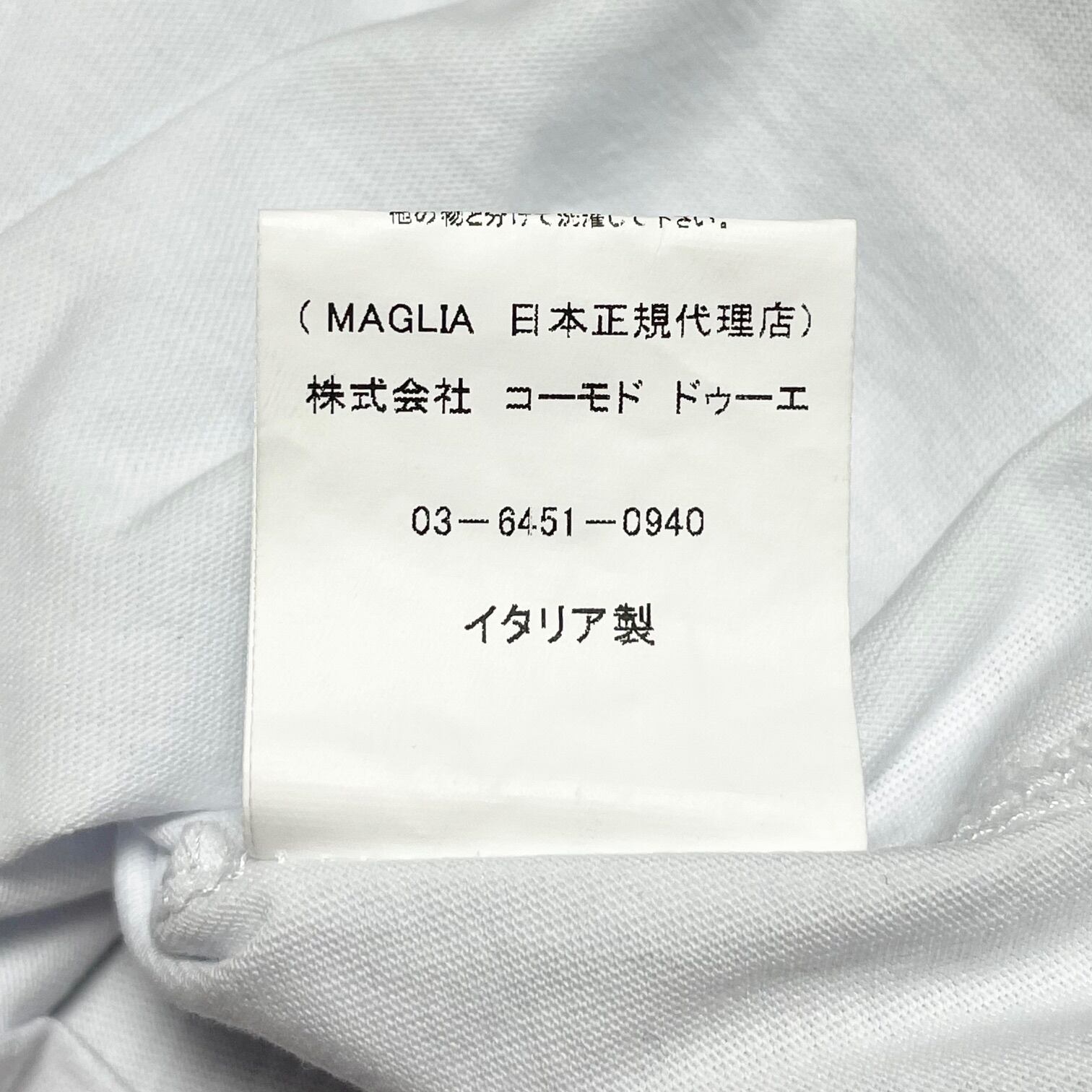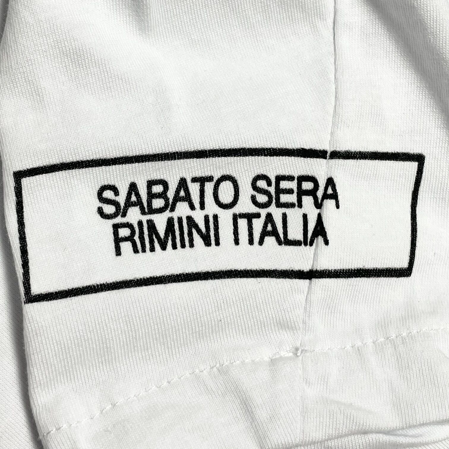 マリアのTシャツはハンドメイド製で柔らかい素材で襟や袖、裾などをねじって縫い込むなど細部までこだわっており、正面にブランド名のMAGLIAの文字と左袖口に「SABATO SERA RIMINI ITALIA」というイタリア語で土曜の夜とマリア発祥の地であるイタリア・リミニの街の名前が入ったオシャレなデザインになっております。