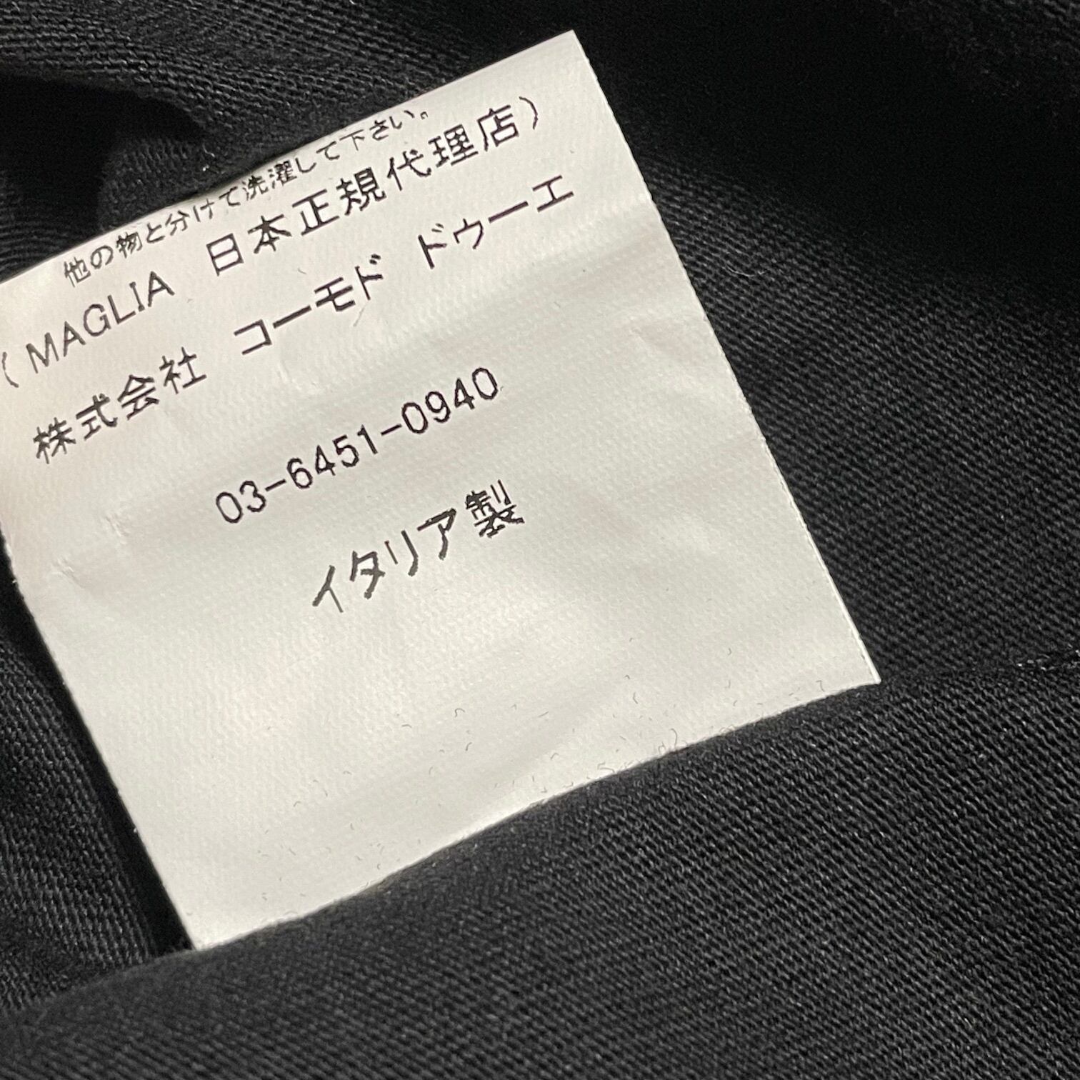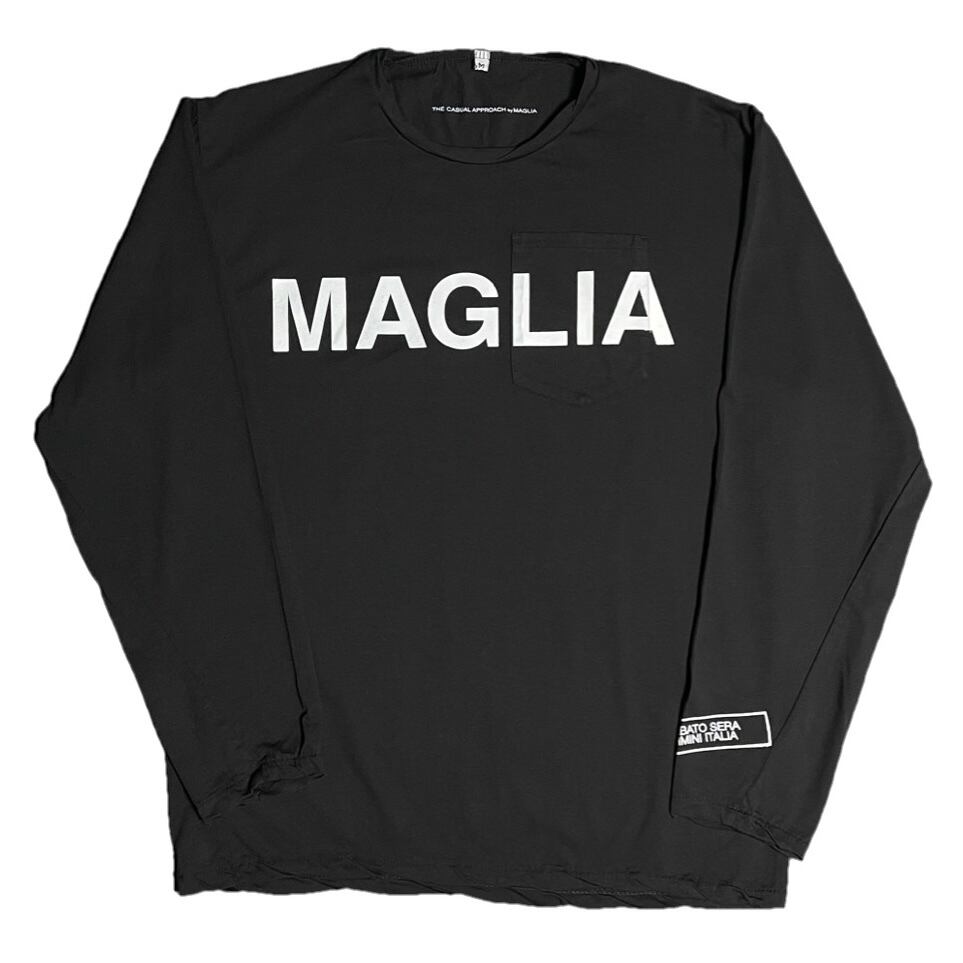 マリアのTシャツはハンドメイド製で柔らかい素材で襟や袖、裾などをねじって縫い込むなど細部までこだわっており、正面にブランド名のMAGLIAの文字と左袖口に「SABATO SERA RIMINI ITALIA」というイタリア語で土曜の夜とマリア発祥の地であるイタリア・リミニの街の名前が入ったオシャレなデザインになっております。