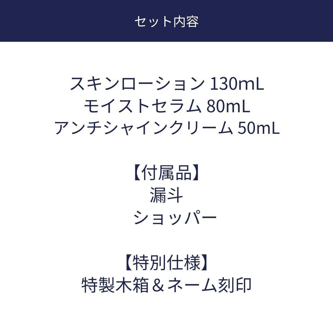 こちらはFigoオリジナルスキットル容器入りの「エイジングケア特化 濃密化粧水」のスキンローションと、「エイジングケア特化 導入美容液」のモイストセラム、アンチシャインクリームの3点がセットになったFigoパーフェクトケアセットの木箱入りギフトセットです。