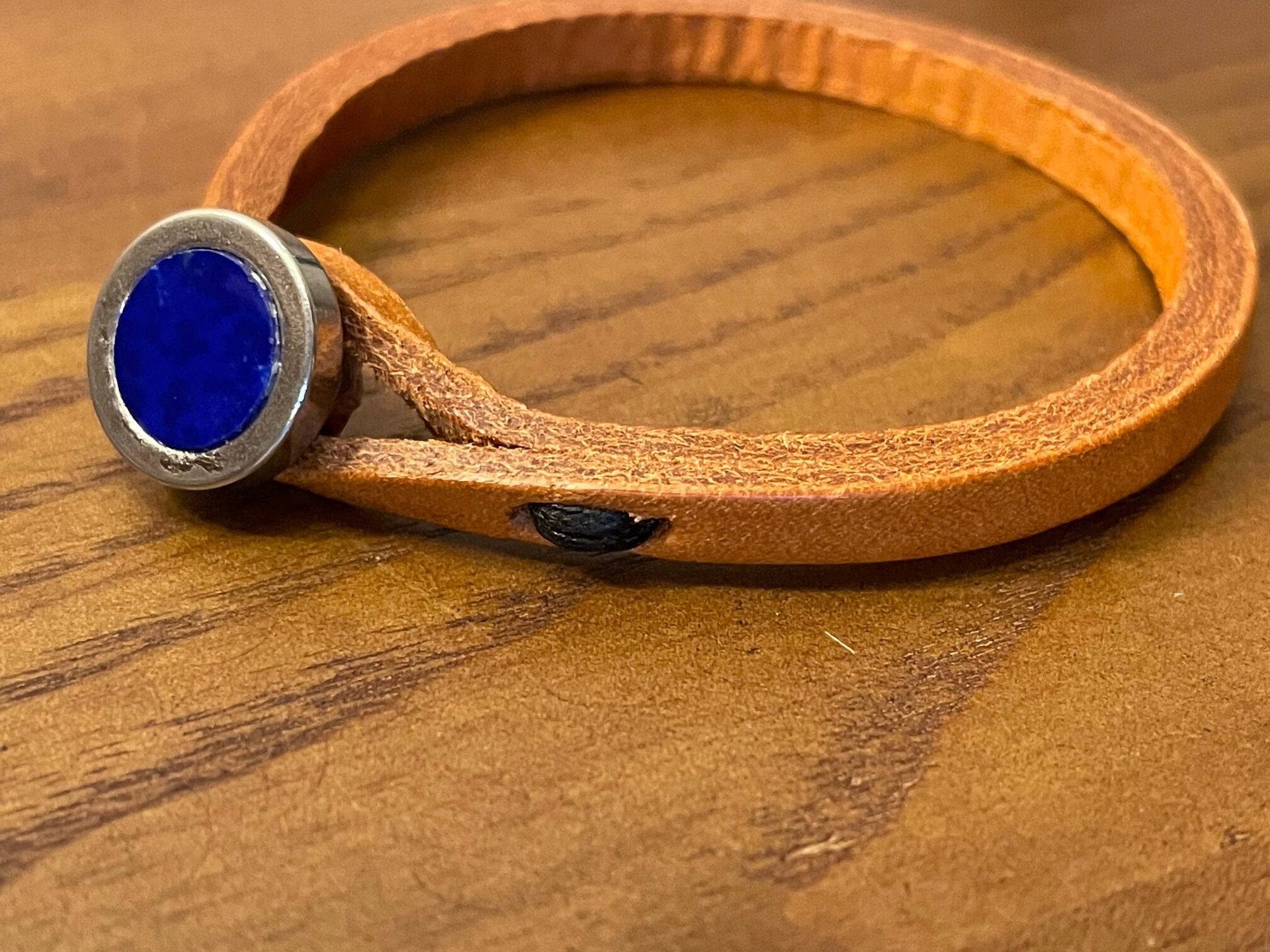 こちらはラピスラズリというパワーストーンを使ったハンドメイドのレザーブレスレットです。